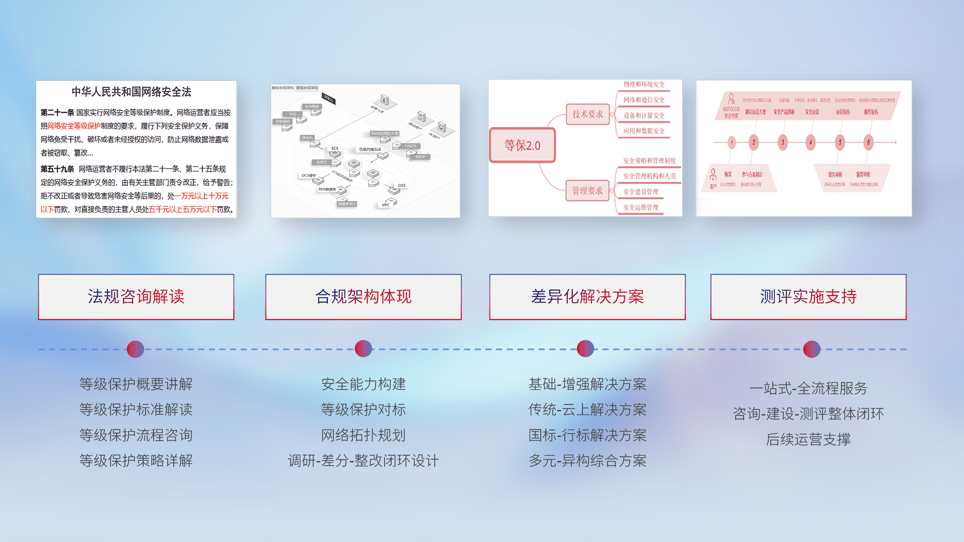 通过专业的法律咨询解读、、合规架构体现、、差异化解决方案、、测试实施支持等服务,,,为客户量身打造等保合规体系。。。。
